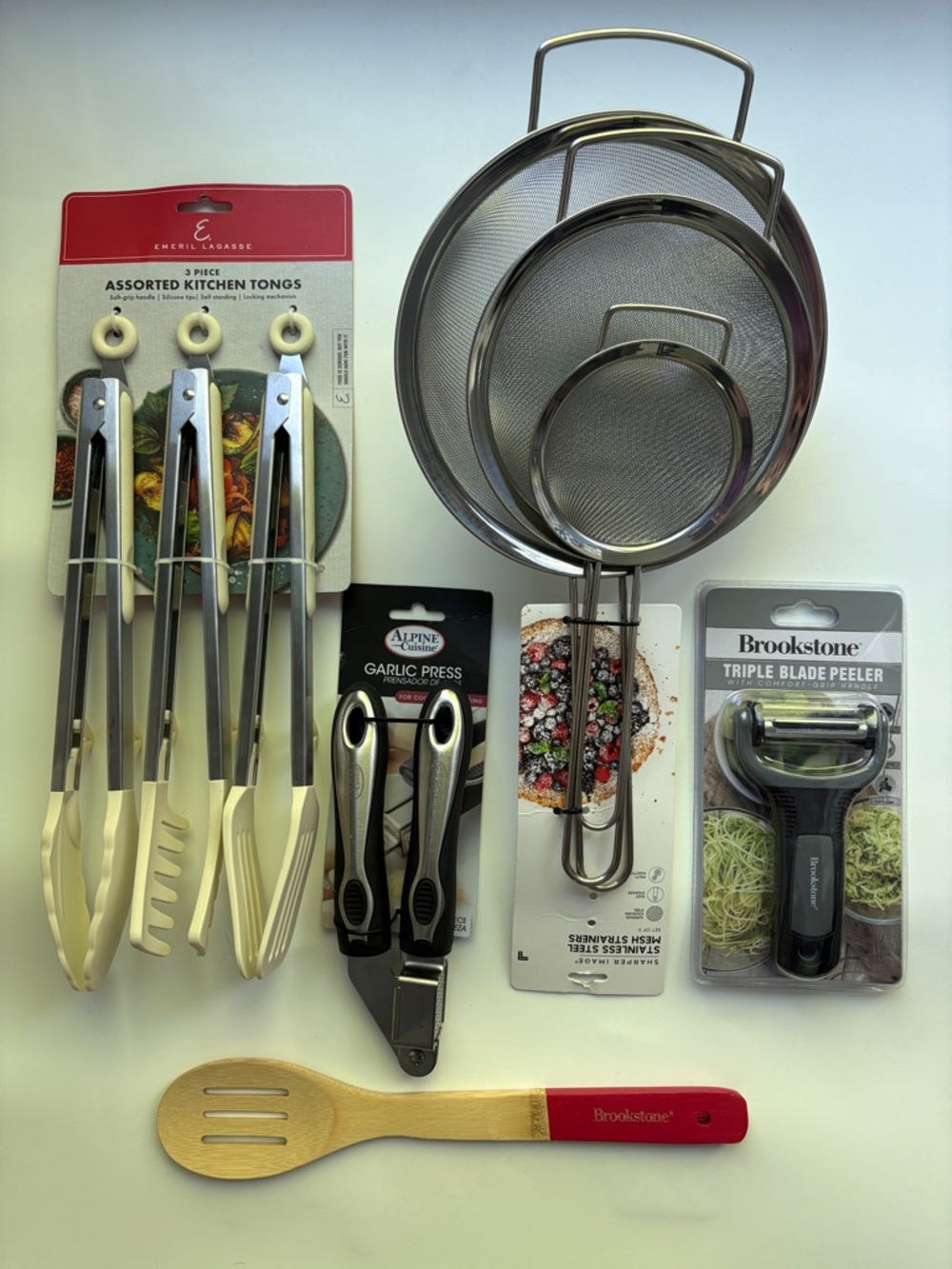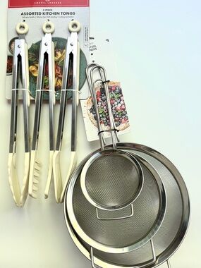 Prep Essentials Set, designed to make everyday cooking easier and more efficient. This practical bundle includes a set of stainless steel strainers, versatile kitchen tongs, a durable garlic press, a multi-blade vegetable peeler, and a classic wooden spoon. Brand new! Basic tools in one bundle!