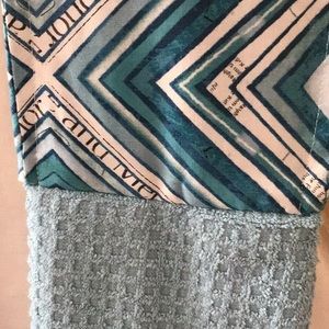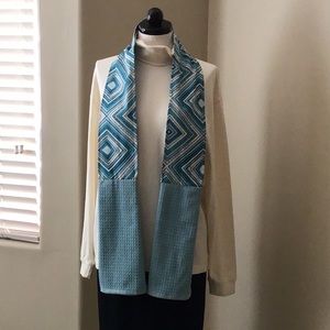 Brand new, never used handcrafted kitchen scarf. Great for wiping hands as you work in the kitchen, eating snacks on the sofa, crafting and anything else requiring constant hand wiping. It is 100 percent cotton, machine washable and dryable. Approximate measurements: Length 71” Width 5”
