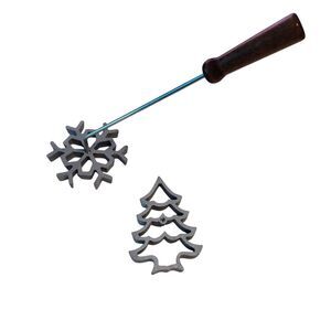 Kitchen Supply Rosette 10 inch wood-handle Iron "Wintersong" pattern 3-pc Set with two Christmas Tree 4" and Snowflake 3.5" aluminum irons/molds. Comes with a Recipe sheet with food craft ideas. Mix up a batter of your favorite Rosette recipe and dip the snowflake or Christmas tree shaped mold in and fry up a batch. Light in taste and not filling, make by the tray, top off with powdered sugar and wait for the crowds to appear. Perfect for a large party gathering for friends and family. These lightweight desserts are great for the Christmas and New Years holidays. There are other pieces (not included) which can be added to this holiday set, they are different sizes, interchangeable and screw on/off. No rust or damage to the handle.