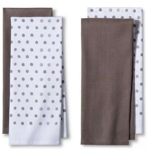 Modern and stylish set of flour sack towels. Set has a total of 4 towels. Towels are solid gray and white an gray polka dotted. Great for drying glasses and adding decoration to your kitchen this season.