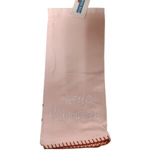 Set of two autumn-themed kitchen towels featuring warm orange tones and seasonal motifs. One towel displays the phrase “Hello, Pumpkin” in white stitching on a peach-orange background, while the other features a heart pattern in shades of blue, orange, and peach. Made from 100% cotton, these towels are soft, absorbent, and machine washable. Perfect for fall décor, gift baskets, or everyday kitchen use.