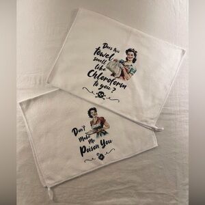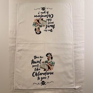 Vintage cartoon design funny Kitchen towels set of 2. Features an added loop at the corner for hanging. Made of a microfiber polyester material. Soft, high absorbent, and fast drying. Machine washable.