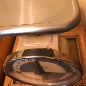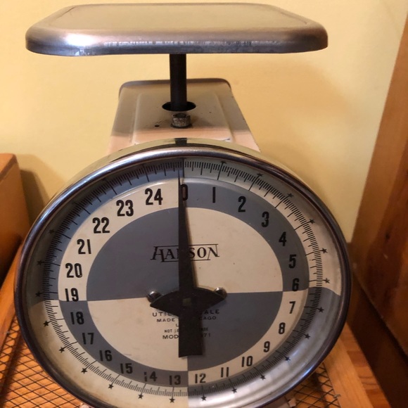 A classic Hanson vintage utility farmhouse kitchen weight scale my mother used to weight any of her receipts that called for pound s for measurements. 25 pound capacity.Dial.Made with metal painted and coated. Model#1371.Made in Chicago, Illinois. Weights Approx 4 lbs.Sturdy.