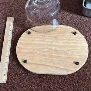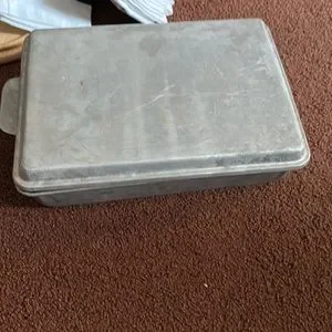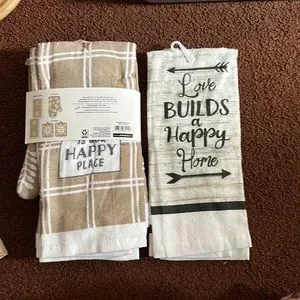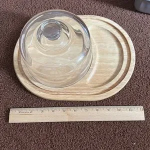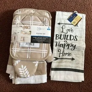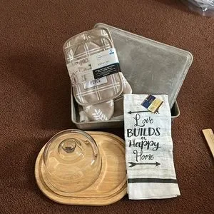 Small charcuterie board with glass lid. NWT set with pot holder and oven mit, NWT Kitchen towel and VINTAGE 9x13 cake pan with lid