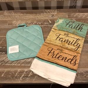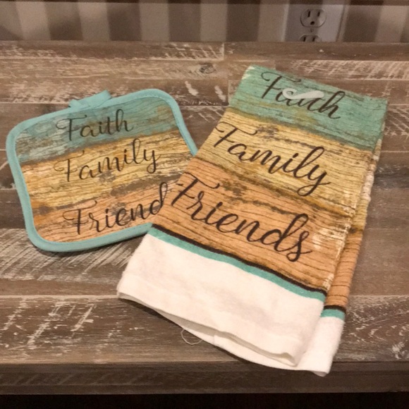 Cute kitchen towel and pot holder set. Says Faith, Family, Friends. Never used. Kitchen towel still has plastic hanger attached.
