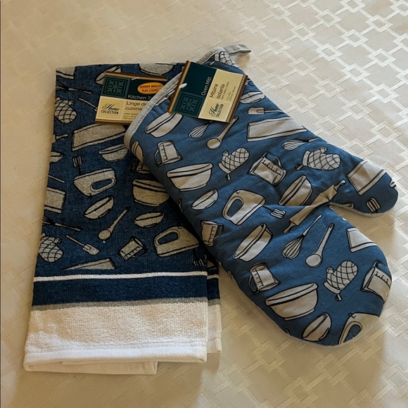 Kitchen towel and oven mitt. Blue, gray, white. New with tags.