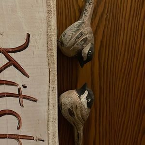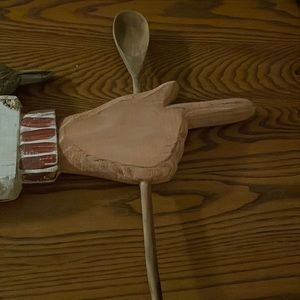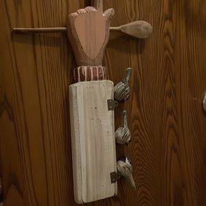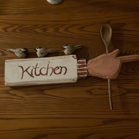 Cute country kitchen sign with chickadees and a wooden spoon. Spoon 15 inches long. Length from end to end is 23 inches. Sleeve that has “kitchen “ written on it is 5 inches wide. Made of wood.
