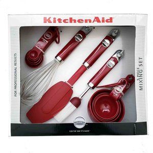 KitchenAid 5 Piece Mixing Set Silicone Mixer Spatula (Exclusive design heat resistant to 500F; flexible head design matchss all KitchenAid mixing bowls Utility whisk 18/8 Stainless Steel Pastry Brush Durable nylon bristles, glazes pastries, scones and ham Measuring spoons (set of 5) Measuring Cups with leveler (set of four cups plus leveler) New in box
