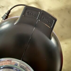 Compact KitchenAid food chopper with a glossy red base. Clear plastic work bowl and lid. Stainless chopping blade for quick prep. Simple one-touch operation.