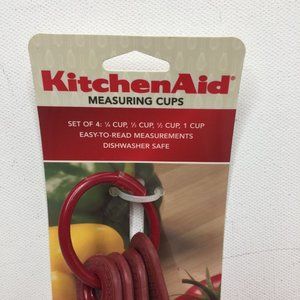 Up for bid is this great set of Red KitchenAid measuring cups with rubber grip handles. The set of four includes 1/4 cup, 1/3 cup, 1/2 cup, 1 cup. Dishwasher safe.