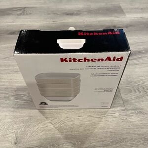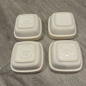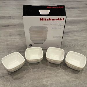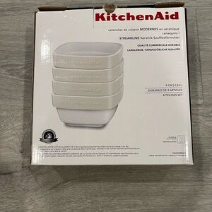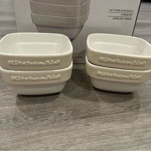 4 KitchenAid square shaped ceramic ramekins. White with cream colored rim. Oven, dishwasher, microwave and freezer safe. So many uses. Each ramekin is 3.5” inches and holds 8 ounces. Stacks easily in kitchen cabinets. Includes original information pamphlet. Brand new never been used. Box opened to take photos.