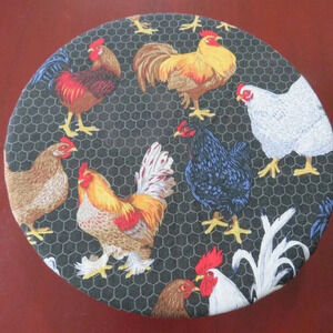 Colorful chickens and roosters on black chicken wire fabric with white and black ticking stripes on reversible side Kitchenaid mixer bowl cover.