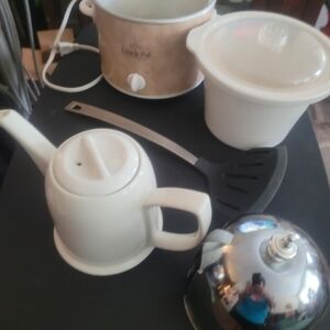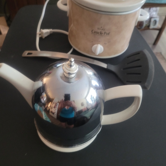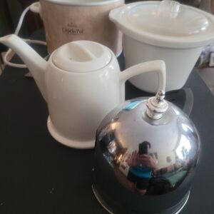HALL porcelain teapot with insulated chrome cozy. $15. SOLD -Rival mini pot with removable crock.