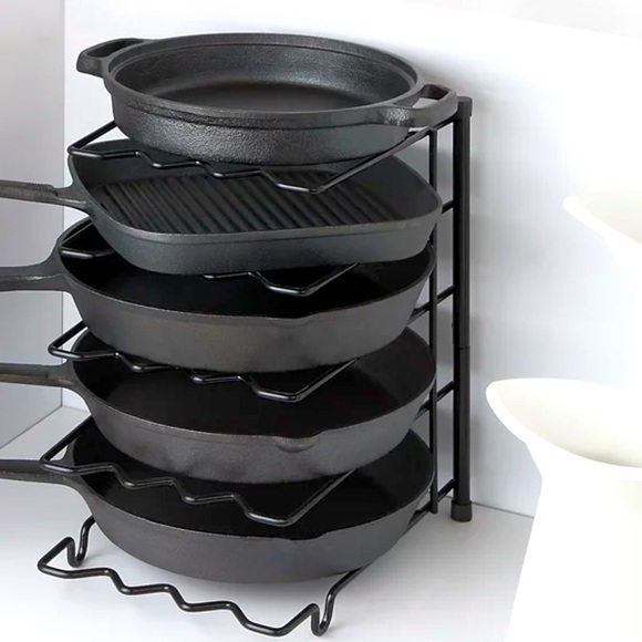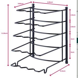 Heavy-duty kitchen countertop cabinet pantry pan, pot lid, and pot organizer rack holder. Powder coated metal rack has 50lb capacity. Shipped new in box, never opened!