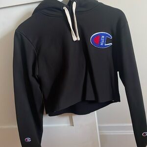 Stylish black hoodie sweater. Features logo patch. Comfortable fit.