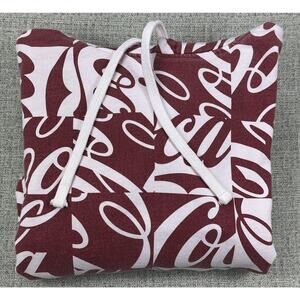 Color/Pattern: Burgundy and white allover Coca-Cola script in block pattern