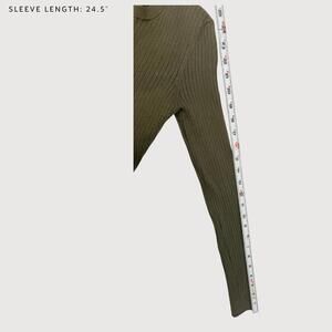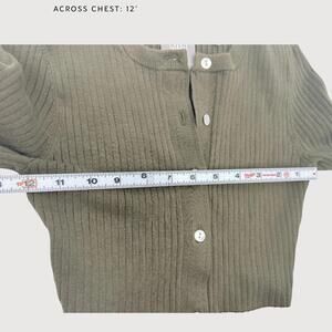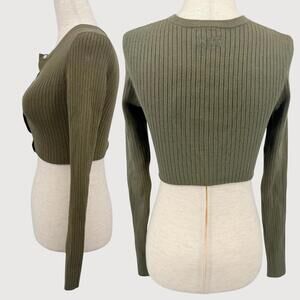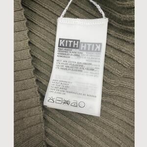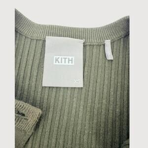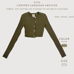 Stylish Kith cropped ribbed cardigan sweater in an olive green tone. This fitted knit features a modern cropped silhouette with ribbed texture and front button closure, making it perfect for layering or wearing on its own.