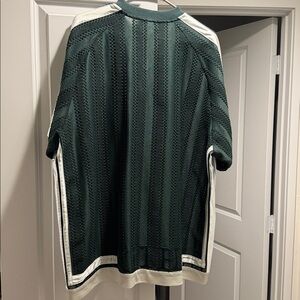 Dark green jersey with white stripe accents. Features V-neck design. Kith logo on chest.