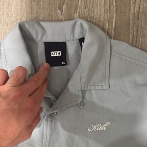 Light gray button-up shirt by Kith. Features embroidered logo and classic collar.
