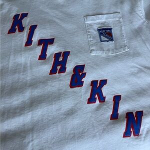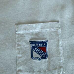 White tee featuring a New York Rangers patch on the pocket. Blue and red details.
