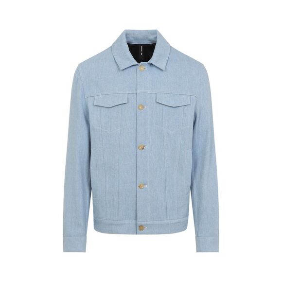 Kiton Light Blue Cotton Jacket. Pure light blue cotton jacket, pointed collar, front buttoned fastening, chest flap pockets, side pockets, long sleeves, buttoned cuffs, straight hem, fully black lining.