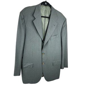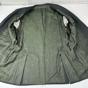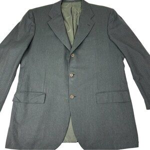 Kiton Napoli Wayne Edwards Diamonte Blu Super 150’s, men's size US 46/IT 56, it is custom fit, notch lapel, three button closure, two pocket design, interior pockets, lined, back double vent, shoulder pads, striped black, grey with green hue and pairs perfect with dress pants, jeans and chino pants. Care dry clean only. Materials 100% wool. MFSR $8000.00. Condition is preloved very good, one stitch loose on button as shown in pictures. Please preview the measurements to ensure fit.