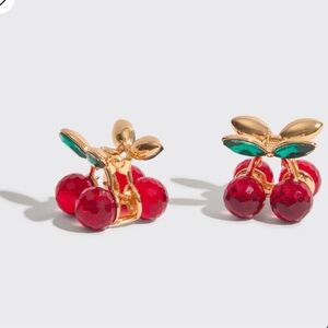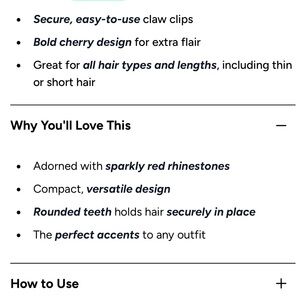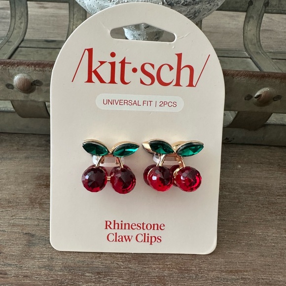Charming cherry-shaped claw clips. Features sparkling red rhinestones and green leaves. Adds a playful touch to any hairstyle.
