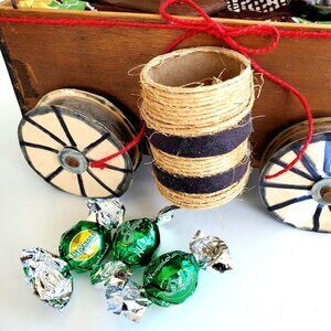 Rustic homemade wood Western wagon with cardboard wheels includes: