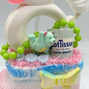 This Playful 3-D Assemblage Sculpture by Kitsch Emporium is created by hand using vintage and rescued materials and layered with decades of charm! This baby themed assemblage is crafted in a ceramic baby bootie planter, with a vintage duck rattle as the star of the show! The little tissue roll is from a 1960s mini doll playset, and the included greeting card is blank inside so you can add your own message! This piece is great for celebrating a new baby, but cute enough to have out all year long. I have a lot of fun making these one of a kind pieces, and hope you love them too!