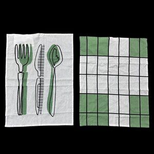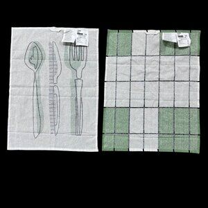 These IKEA Rinnig cotton dish towels feature an eye-catching kitschy design in a striking green, black, and white color scheme. Equipped with a convenient hanging loop, they're both stylish and functional. They have no rips, tears, or stains. Please see the pictures for the full description.