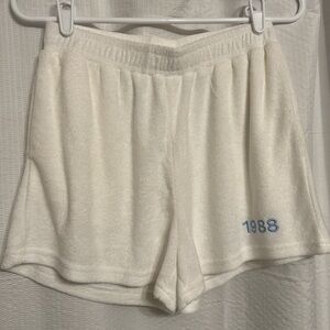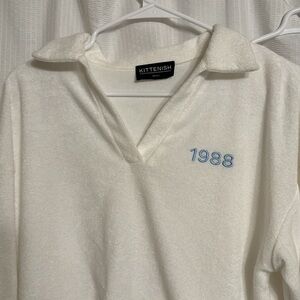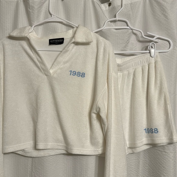 NWOT- white, towel like material matching set loungewear. Top is cropped, long sleeved and collared. Elastic waistband shorts