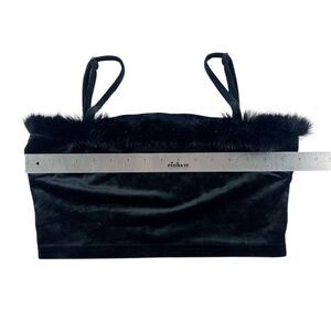 Kittenish Party Girl Black Velvet Spaghetti Strap Crop Top Faux Fur Trim Medium