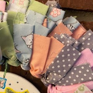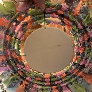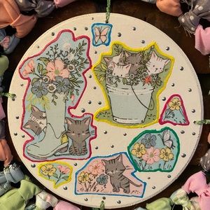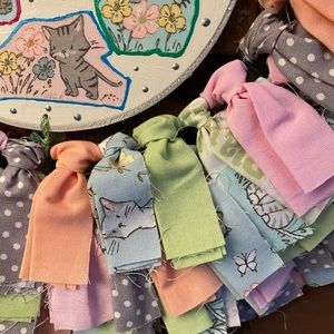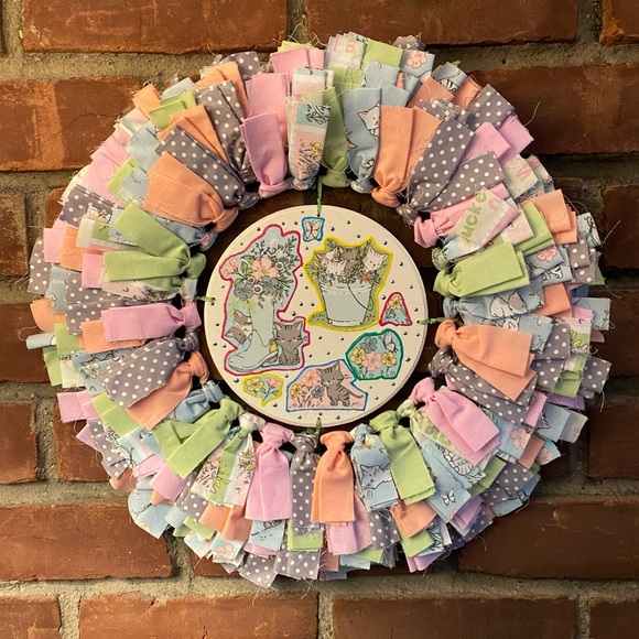 This is a new handmade Kittens Rag Wreath in the colors light blue , pink, light orange, green and purple. In the center has a wooden sign with kitten details. The frame is 8-12” and the diameter of the finished product is 17”.
