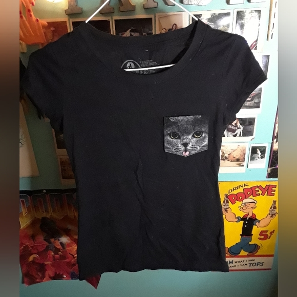 Black fitted tee with kitty pocket. Get wild, size small. 60% cotton 40%polyester. No damage. (A87)