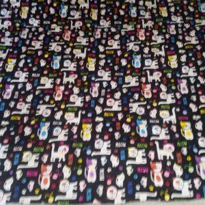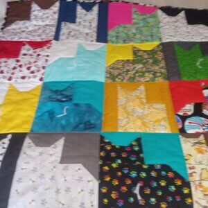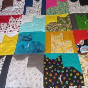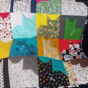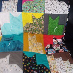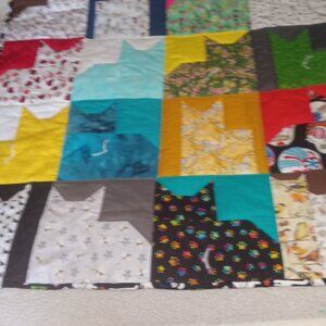 36 x 36 inch hand made Kitty Quilt with machine quilting, hand tying and hand binding. Cotton fabric with polyester batting.