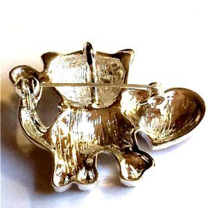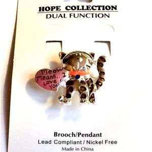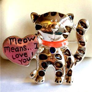 Kitty Cat Pin Brooch Pendant MEOW MEANS LOVE Cat MOM Heart Silver Plated