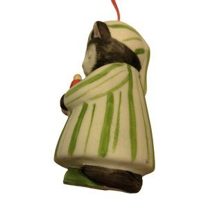 Kitty Cucumber Ornament, Ellie in Nightgown is a vintage ceramic figurine from Schmid Shackman circa 1985. It features a charmingly styled cat in a nightgown.