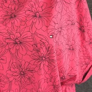 Pretty Tommy Hilfiger tee shirt, coral-pink with line drawing flowers on it.