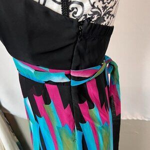 Kitty Y2K black strapless bust with built in padding.  Side zip closure.  A-line cut with Flowy colorful skirt.  Tie at waist.  100% polyester.  Size medium.