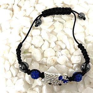 NEW ITEM - These bracelets were purchased by me for my granddaughters birthday party that had to be cancelled. They were suppost to be party favors. They are new in their jewelry plastic packages and they will come with a gift box. The bracelet is 5" diameter closed and opens to 8" wide. You open them by pulling the braded bracelet and close it by pulling the string. The braded bracelet is black with black beads and blue rhinestone beads on each side of the face. The face is silver color filled with clear rhinestone beads and a blue rhinestone bow. The face is 1" wide by almost 1" hi.