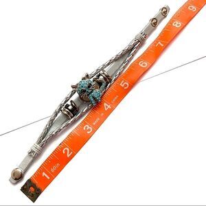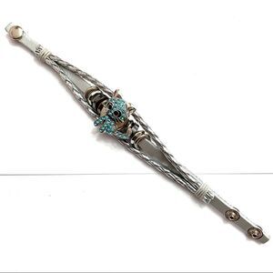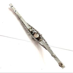 Snap bracelet with a Snap Kitty Charm. The kitty snap can be changed out if you have other snaps. This bracelet will fit 18mm ginger snaps. It is leather with a silver colored coating. The metal of the bracelet is an iron alloy. The bracelet length is about 8.5”. It will snap at about 7.5” and 8.25” The kitty snap is made out of zinc alloy and blue rhinestones.