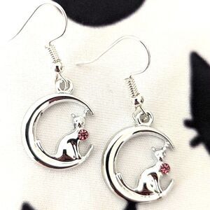 Kitty Cat Crescent Moon Pink Rhinestone Earrings