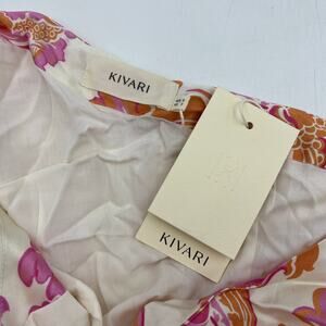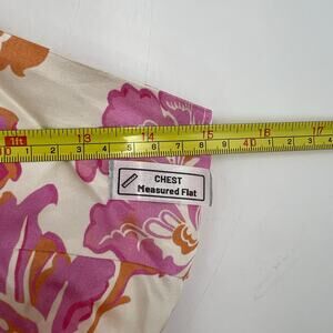 New with tags. Lined bust and no pockets. One end of the shoulder drawstring has wear and light discoloration upon close inspection. Hidden side zipper entry. Josefina is a wallpaper style floral with pops of pink and orange on a cream base. The Josefina Maxi Dress features a shoulder tie with an adjustable keyhole opening, asymmetrical neckline, gathered detail at the side waist, complete with a subtle flared hem.