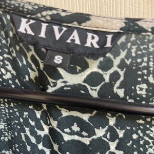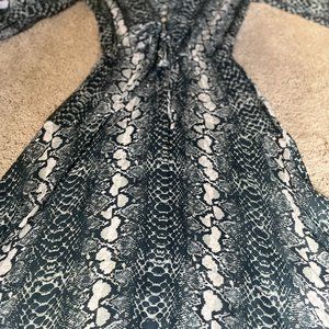Adorable snake print dress from Kivari. A super flattering dress that can be dressed down and worn as a sun dress or dressed up with white cowboy boots. Very comfortable. It has a button-down top with a tie for a fitted look.