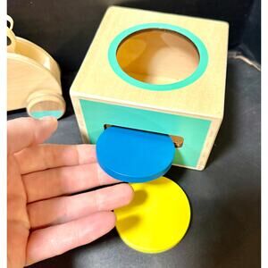Shape sorter…slide the discs in the front rectangle or drop them into the circle in the top.