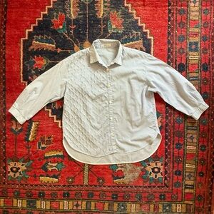 A classic button-up… with a twist! Half the front is puckered, creating a unique textural effect. Subtle but special.