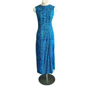 Hawaiian vintage blue barkcloth leaf print sleeveless maxi dress