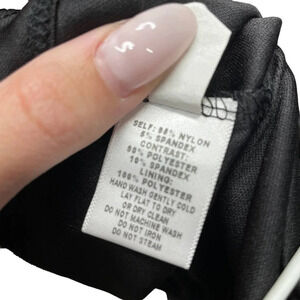 95% nylon 5% spandex; contrast is 90% polyester 10% spandex; lining is 100% polyester