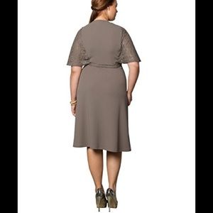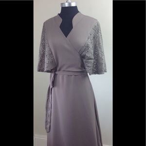 Classic A-line wrap dress. Designed with dramatic kimono-style sleeves with lace and a Mandarin collar. Fabric: 95% Polyester, 5% Spandex. 2x measures approximately 44.5" from high point of shoulders to hem.