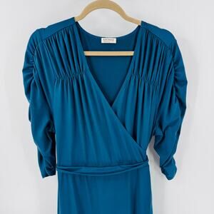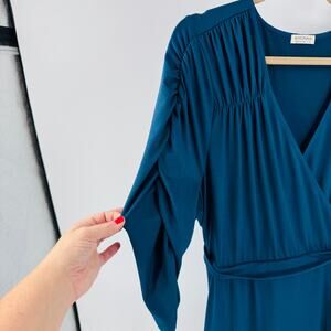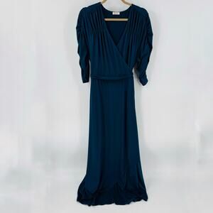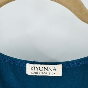 Elegant Kiyonna Meadow Dream maxi dress in Topaz blue. Features a faux-wrap V-neckline, ruched shoulders, and flowing skirt for a flattering silhouette. Women’s plus size 2X. Excellent like new condition. Made in the USA.